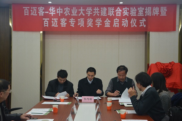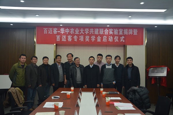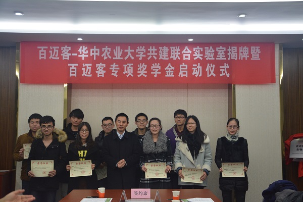 在商用云計算平臺成功上線(xiàn)后,百邁客啟動(dòng)了云平臺戰略又一重大舉措-全國重點(diǎn)區域的布點(diǎn)及人才隊伍建設。2015年12月1日 ,“百邁客-華中農業(yè)大學(xué)共建聯(lián)合實(shí)驗室揭牌暨獎學(xué)金頒發(fā)儀式”在華中農業(yè)大學(xué)隆重舉行。