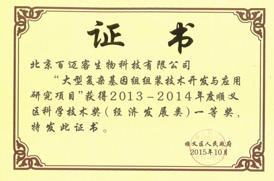 1月19日上午9:00,順義區科技技術(shù)獎勵大會(huì )在北京市順義賓館隆重召開(kāi),北京市科學(xué)技術(shù)委員會(huì )張光連副主任、順義區政府朱家亮副區長(cháng)、順義區科學(xué)技術(shù) 委員會(huì )金泰希主任及區各委、辦、局、園區、鎮代表出席了本次大會(huì )。大會(huì )對獲得2013年至2014年度的科學(xué)技術(shù)獎的單位進(jìn)行了表彰。其中百邁客公司自主 研發(fā)的《大型復雜基因組組裝技術(shù)開(kāi)發(fā)與應用研究》項目榮獲經(jīng)濟發(fā)展類(lèi)獎項一等獎。