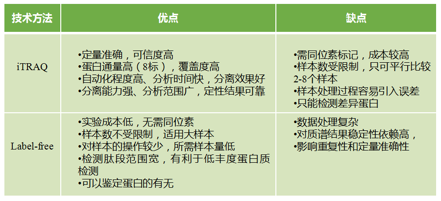 以質(zhì)譜為基礎的定量蛋白質(zhì)組學(xué),主要可以分成兩類(lèi),第一種是穩定同位素標記的定量蛋白質(zhì)組學(xué),比如iTRAQ;第二種是非標記的定量蛋白質(zhì)組學(xué)技術(shù),比如label-free。iTRAQ定性定量結果更為準確,通量較高可同時(shí)標記2-8個(gè)樣本,但是對樣本數有一定限制且不適用于低豐度蛋白的定量,適合小樣本量的項目;label-free檢測肽段范圍廣,單次可鑒定和定量較多的蛋白質(zhì),但由于樣品單獨進(jìn)行質(zhì)譜檢測所以重現性較低,在大量算法的基礎上更適合大量樣本的蛋白組研究。