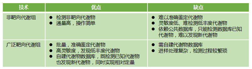 非靶向代謝組和廣靶代謝組是目前代謝組學(xué)常用的技術(shù)。非靶向代謝組是將對照組和實(shí)驗組樣本的全部代謝物進(jìn)行比對,以找出其代謝物的差異。廣靶代謝組是高通量、高靈敏度靶向代謝物檢測技術(shù),提供了定性、定量檢測大批量、低豐度代謝物高效的方法, 有助于全面解析差異代謝物與代謝途徑。
