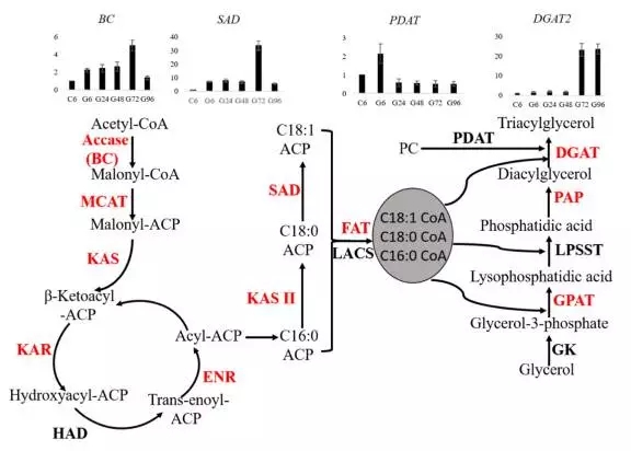 藻類(lèi)和植物中脂肪酸的生物合成主要在葉綠體中進(jìn)行。乙酰-CoA作為合成的起始物質(zhì)?;谵D錄組測序,小球藻質(zhì)體中脂肪酸合成基因被鑒定到。在葡萄糖處理情況下,這些基因大都表達量上調。另外這次測序結果中還發(fā)現幾個(gè)基因對應的不同轉錄本。由于BC和SAD是脂肪酸合成的限速酶基因,做了進(jìn)一步分析,發(fā)現BC和SAD表達量從6h到72h表達量持續上升,對應的三酰甘油含量從24h到96h持續增加。