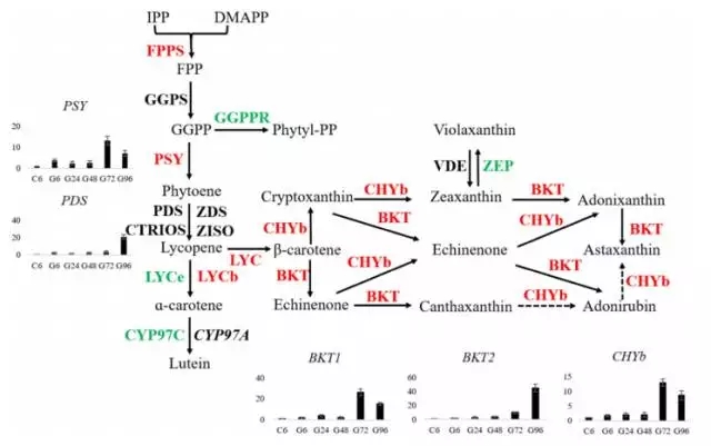 在轉錄組測序結果中,發(fā)現MEP通路中的8個(gè)基因都被鑒定到,但是在MVA通路中只有2個(gè)基因被檢測到,其中HMG表達不顯著(zhù),ACAT表達量下降。這些結果表明小球藻中蝦青素的合成通路中IPP和DMAPP是MEP通路合成的。其中,發(fā)現一個(gè)可能編碼β-胡蘿卜素激酶(BKT2)與數據庫中的BKT1比對率僅為56%。功能分析發(fā)現BKT2可以轉化β-胡蘿卜素成為角黃素。下圖為蝦青素合成通路圖。在葡萄糖處理情況下,與蝦青素合成相關(guān)的6個(gè)基因上調差異表達。在小球藻中,葡萄糖誘導蝦青素的合成,伴隨著(zhù)BKT1,CHYb,PDS在24h內上調表達。為研究轉錄組水平基因表達量與產(chǎn)物含量的關(guān)系,分析了5個(gè)限速基因的表達量,這些基因在葡萄糖處理72h或92h表達量達到最高,相應的,蝦青素的積累量也在96h達到穩定水平。