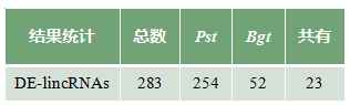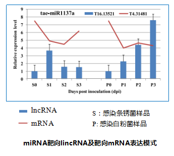 對miRNA的靶標lincRNA和靶標mRNA的調控作用關(guān)系進(jìn)行驗證,發(fā)現經(jīng)Pst 或Bgt侵染后共同表達的lincRNA及共同表達的mRNA大都表現出了相反的表達模式。表明,小麥中linRNA可能通過(guò)與miRNA作用間接影響mRNA的表達。