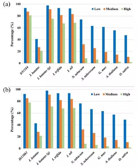 為了評估甘薯、野生甘薯的轉錄本和其他植物基因的相似性,我們比較了甘薯、野生甘薯與其他植物的開(kāi)源CDS數據庫,包括紅苔藤、野生甘薯、牽?;?、煙草、馬鈴薯、大豆、擬南芥和水稻。結果表明甘薯和野生甘薯大多數的轉錄本都是同源的,說(shuō)明這兩個(gè)物種擁有一個(gè)大致相同的基因庫。觀(guān)察高比例的轉錄本發(fā)現,盡管這些物種中的大量基因在進(jìn)化過(guò)程中存在著(zhù)巨大的差異,但仍然共有一些短的motif,說(shuō)明這些基因在進(jìn)化上顯示出高度的保守性。