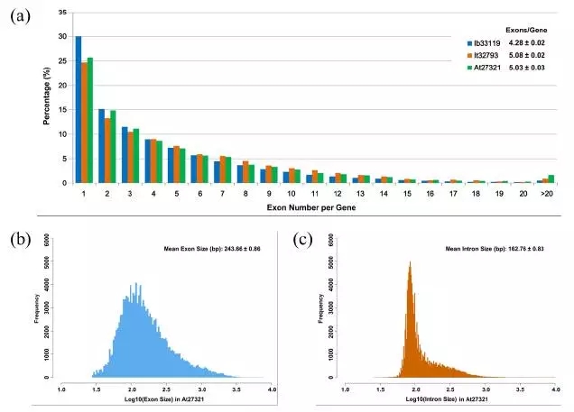 三代測序得到的全長(cháng)cDNA對于研究基因的結構非常有用,例如分析外顯子-內含子的結構。我們隨機挑選了50個(gè)基因進(jìn)行比較,發(fā)現這些基因含有的外顯子數目在甘薯、野生甘薯和擬南芥三個(gè)植物中的分布是相似的。