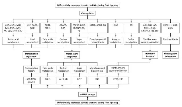 為了進(jìn)一步揭示circRNA在果實(shí)成熟中的作用,我們對circRNA靶向的miRNA以及miRNA的靶標mRNA進(jìn)行了預測。結果發(fā)現其中20個(gè)circRNA上含有7個(gè)miRNA結合位點(diǎn),同時(shí)鑒定出94個(gè)miRNA的靶標mRNA。通過(guò)對鑒定到的94個(gè)靶標mRNA進(jìn)行GO富集和KEGG分析,總結出circRNA可能通過(guò)調節代謝過(guò)程、激素平衡以及光合相關(guān)的通路來(lái)調控番茄果實(shí)成熟。此外,circRNA還可能通過(guò)參與轉錄調控,主要是通過(guò)調節包括ERF、SBP、MYB等果實(shí)成熟相關(guān)的轉錄因子,來(lái)調節番茄果實(shí)的成熟。