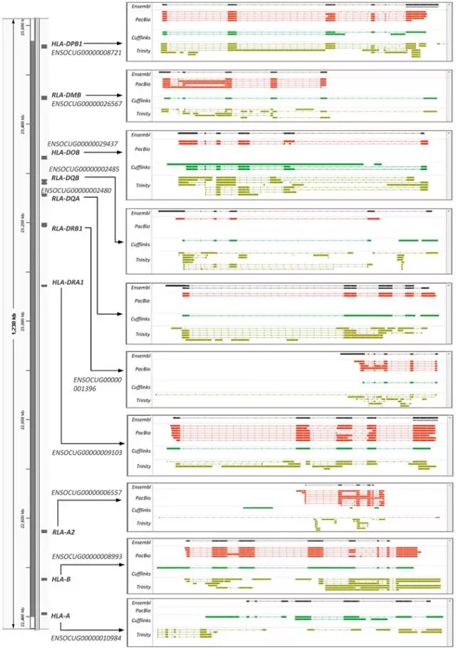 Figure 4.基因通過(guò)PacBio所測轉錄本和組裝得到的轉錄本還原10個(gè)MHC基因。染色體定位、命名和每個(gè)基因的Ensembl編號(在左側)。