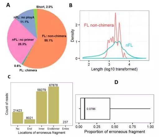 共獲得802,358個(gè)ROIs序列,其中有1.466,034全長(cháng)非嵌合(FL)序列和316,000非全長(cháng)(nFL)序列。