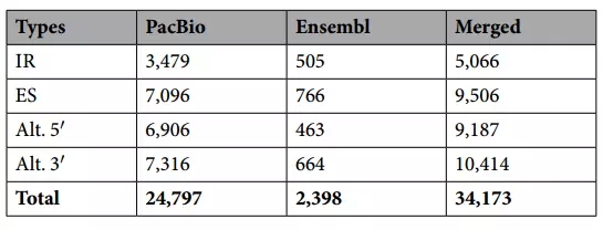 Table 1.可變剪接事件分析(IR:內含子保留;ES:外顯子跳躍;Alt.5’:可變的5’端;Alt.3’:可變的)