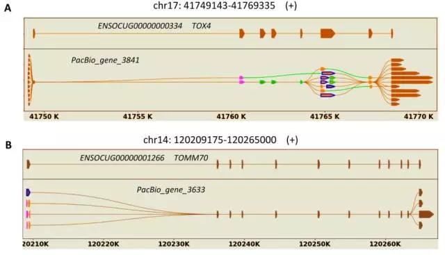 Figure 2. 三代測得轉錄本的不同isoforms,在數據庫中的參考基因模型如圖示中被標記有染色體位置、基因ID和基因名稱(chēng)