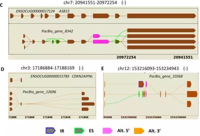 PacBio鑒定到多達24,797個(gè)AS事件,并對這些可變剪接進(jìn)行分類(lèi)統計(Table 1),在兔的參考基因組中僅發(fā)現2,398個(gè)AS事件,將數據合并后共得到34,173個(gè)AS事件,且可變剪接事件包含不同的4中類(lèi)型,另外,鑒定到11,184個(gè)APA事件。挑選5個(gè)基因,并用圖表示出不同的isoform比對到參考基因模型上(Figure 2)。