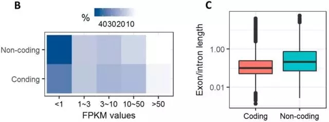 通過(guò)比對到參考蛋白數據庫,有30,183個(gè)轉錄本可編碼蛋白、6,003個(gè)轉錄本不能編碼蛋白,并且這些非編碼的轉錄本外顯子少、表達量低、且外顯子與內含子在長(cháng)度上的比值相較于可編碼蛋白的轉錄本略高(Figure 3)。對轉錄本進(jìn)行分類(lèi)(Table 2)。