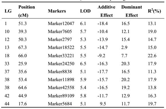 利用區間作圖法,定位到體重和體長(cháng)QTL共11個(gè),共可解釋表型變異為38.56%。其中位于連鎖群33標記24250位置的QTL解釋表型變異達到17.9%,LOD值為6.5,為一主效QTL。