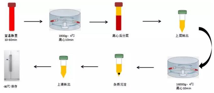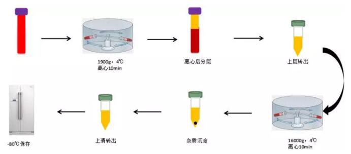 使用EDTA抗凝管采集血液樣品(采集后的血液樣品可置于室溫或4℃短暫保存,但不得超過(guò)1h)。1900g(或3000rpm),4℃,離心10min。小心轉移上層血漿(黃色)至新的1.5ml離心管中,槍頭不要觸碰中間層(白細胞和血小板層)。一般情況下,10ml的血液可分離出4-5ml血漿。將分離出的血漿16000g,4℃,離心10min。槍頭不要觸碰到管底一側的雜質(zhì),小心轉移上清到一個(gè)新的1.5ml離心管中,-80℃保存。大體積干冰運輸。