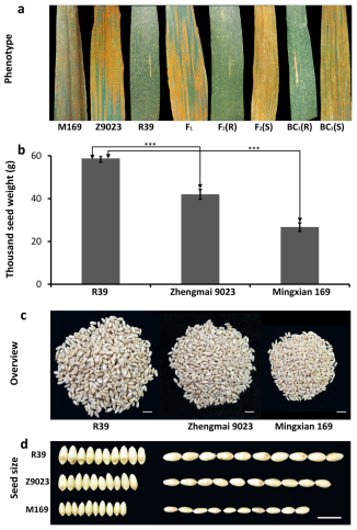在抗性鑒定中發(fā)現,其在幼苗期對7種病菌均呈現感病,而成株期均呈現抗?。▓D1a);而鄭麥9023和銘賢169全生育期均為感病。此外,R39的千粒重顯著(zhù)高于鄭麥9023和銘賢169,這表明在條銹病發(fā)病條件下,R39的籽粒產(chǎn)量更高,種子質(zhì)量更好(圖1b-d)。