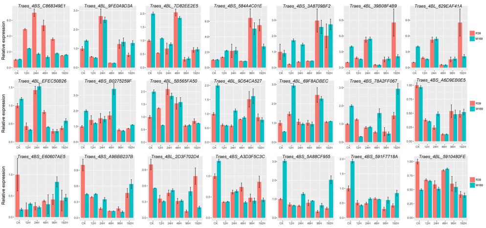 目標區域包含126個(gè)基因(表3),通過(guò)功能注釋?zhuān)业?1個(gè)與條銹病抗性相關(guān)的基因,擬定為候選基因,并進(jìn)行qRT-PCR驗證。結果表明,在病菌接種后12、24、48和96h,只有候選基因Traes_4BS_C868349E1(注釋為F-box / LRR-重復蛋白)在R39中顯示出比在銘賢169中更高的表達水平(圖4)。 這表明其可能參與了R39對條銹病的抗性。