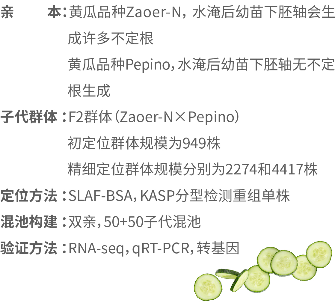 黃瓜是重要的蔬菜品種,其根生長(cháng)淺,對氧氣需求較為嚴格,這造成它對水淹脅迫非常敏感。在水淹脅迫下,黃瓜下胚軸通過(guò)產(chǎn)生不定根來(lái)獲取氧氣,以適應水淹脅迫。為解析水淹脅迫下黃瓜不定根生產(chǎn)現象的遺傳學(xué)機制,研究者曾利用耐水淹材料Zaoer-N 和不耐水淹材料Pepino構建的群體進(jìn)行QTL定位,已經(jīng)分離了一個(gè)控制不定根數目的主效QTL ARN6.1,該QTL在多年的實(shí)驗均解釋了較高的表型貢獻率。本研究將對該QTL進(jìn)行精細定位,確定引起性狀差異的基因,并進(jìn)行多方面的驗證。