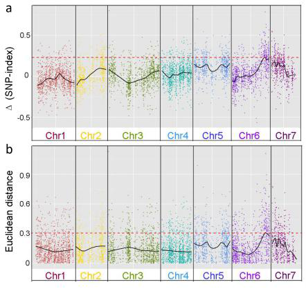 利用SLAF-seq的方法對親本及兩個(gè)極端混池進(jìn)行測序,親本測序深度分別為29.18×和22.85×,兩個(gè)混池的深度分別為50.6×和53.72×,以9930為參考基因組,利用△SNP-index和ED的方法計算顯著(zhù)關(guān)聯(lián)位點(diǎn),將關(guān)聯(lián)區域定位在6號染色體標記SLAF_marker_192310和SLAF_marker_192096之間,區間大小301kb(圖3)。
