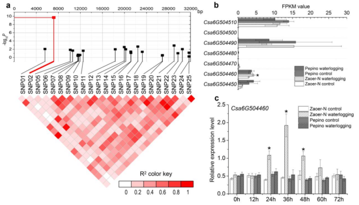 2個(gè)親本重測序分析,在36.1kb的區間內開(kāi)發(fā)到25個(gè)SNP,為確定哪個(gè)SNP與性狀真實(shí)相關(guān),研究者對100個(gè)黃瓜自交系的23個(gè)SNP(2個(gè)SNP只存在于Zaoer-N中而被過(guò)濾掉)進(jìn)行分型,結合每個(gè)自交系不定根數目的表型數據進(jìn)行局部關(guān)聯(lián)分析,結果顯示SNP02與表型有較強的關(guān)聯(lián)性。對SNP02分析發(fā)現,其位于Csa6G504460的第二外顯子,可能就是引起變異的SNP位點(diǎn)(圖5a)。