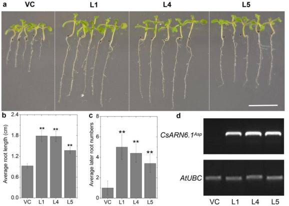 為驗證CsARN6.1的功能,將CsARN6.1^Asp轉入擬南芥中,發(fā)現轉基因植株的根長(cháng)顯著(zhù)長(cháng)于對照,同時(shí),轉基因植株上可以明顯觀(guān)察到側根發(fā)育,而對照組則沒(méi)有側根發(fā)育(圖8)。為進(jìn)一步驗證,研究者將CsARN6.1^Asp轉入黃瓜品種Xintaimici(CsARN6.1^Gly型),并經(jīng)多代自交和篩選,獲得單拷貝的純合轉基因植株。發(fā)芽后3天,轉基因植株的初生根長(cháng)度顯著(zhù)長(cháng)于野生型。水淹處理后,轉基因黃瓜下胚軸中CsARN6.1的表達量顯著(zhù)高于野生型。處理后7天,轉基因黃瓜下胚軸的不定根數目明顯高于野生型(圖9 e.f.g.h)。另外,野生型黃瓜葉片和子葉的萎黃病較轉基因黃瓜嚴重。以上轉基因結果證實(shí)CsARN6.1能夠促進(jìn)不定根形成和黃瓜水淹耐受力(圖9 i.j)。