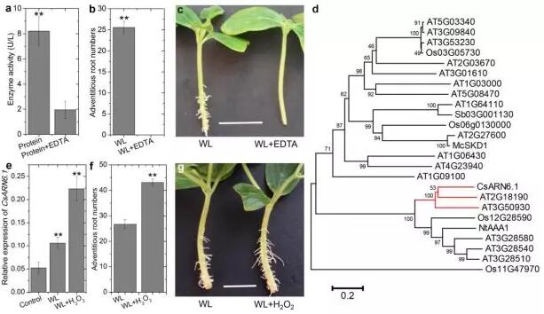 進(jìn)化樹(shù)分析顯示,CsARN6.1與擬南芥At2G18190和At3G50930存在較高的同源性(圖10d),而在之前研究中發(fā)現,H2O2處理擬南芥后,At2G18190.1和At3G50930.1被顯著(zhù)誘導表達。水淹后植物體內H2O2積累是普遍的生理響應。因而研究者嘗試在水中加入H2O2后處理Zaoer-N幼苗,與無(wú)水處理的對照相比,48h后處理組植株CsARN6.1的表達量是對照組的4.3倍,與不加H2O2的水處理的對照相比,48h后CsARN6.1的表達量是對照組的2.1倍(圖10 e)。5天后統計不同處理的材料下胚軸不定根數目,發(fā)現與不加H2O2的水處理的對照相比,水中加入H2O2的處理組的不定根數目增加60%(圖10 f.g)。