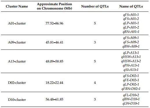 作者以10 Mb(?20 cM)物理區域包含兩個(gè)或多個(gè)QTL定為QTL簇標準。在5條染色體上檢測到5個(gè)QTL簇,每個(gè)簇至少有3個(gè)QTL(表1)。其中3個(gè)位于A(yíng)基因組,2個(gè)位于D基因組中。鑒定出含有影響纖維品質(zhì)和產(chǎn)量性狀的多個(gè)QTL的基因組區域,有利于后期分子改良。