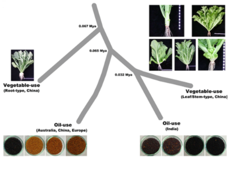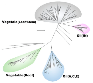 研究中還發(fā)現了Vegetable (Root)型最先分化,然后是Oil (A,C,E),最后是Oil (IN) 與Vegetable (Leaf/Stem)的分化,并計算分化時(shí)間,分別是:0.067 Mya,0.065 Mya和0.032 Mya