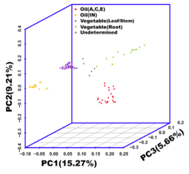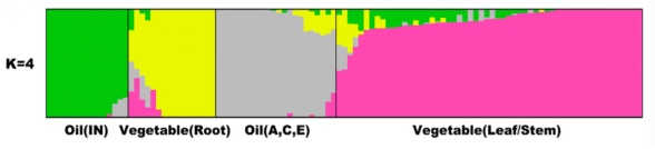 利用主成分分析來(lái)評估遺傳變異,分析結果顯示主要分為4個(gè)群:Vegetable(Leaf/Stem),Vegetable (Root),Oil (IN)和Oil (A,C,E),該結果與系統發(fā)育樹(shù)結果一致。