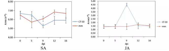 3)如圖3所示, Ontario 792中,SA含量剛開(kāi)始緩慢下降,然后緩慢上升直到16 dpi。Moneymaker中,SA含量在5 dpi下降至最低水平,然后逐漸增加直到12 dpi。Ontario 792中,從5 ~ 9 dpi JA含量迅速上升到峰值,然后從9到12dpi下降到原始水平,但Moneymaker中始終保持相對穩定,表明JA可能參與激活對C. fulvum的防御系統。