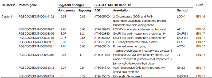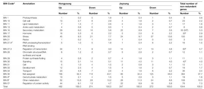 Hongyoung 、 Jayoung和Hongyoung 和 Jayoung共1044個(gè)差異基因;Hongyoung 和 Atlantic 中有 756 個(gè)差異基因,其中482 個(gè)基因上調,274 個(gè)基因下調。Jayoung 和 Atlantic 中有519 個(gè)差異基因,其中有248個(gè)上調基因,273個(gè)下調基因。根據其注釋功能將其分為20組(主要BIN),分為未知注釋轉錄本(37.7%),蛋白質(zhì)活性調控(10.3%),應激(9.6%) ,其他代謝(7.3%),轉錄調控因子(5.7%),次級代謝(5.3%)和信號傳導(4.0%)。