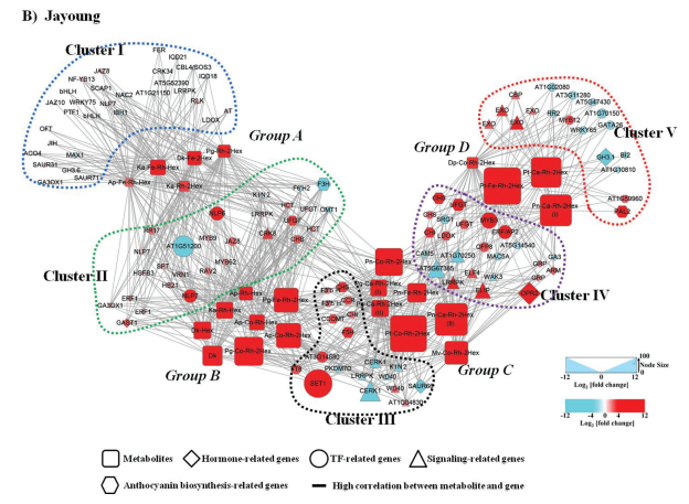 Hongyoung中 Group A 代謝物的含量高于Jayoung,與 Cluster I 和 Cluster II 中的基因有較高的關(guān)聯(lián)性。而在 Jayoung 中 Group D 代謝物的含量較高,與 Cluster IV 和 Cluster V 中的基因有較高的關(guān)聯(lián)性。