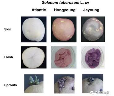 樣品準備:Hongyoung(淡紅色)、Jayoung(深紫色)、Atlantic(白色),在室溫散光照射下,誘導馬鈴薯發(fā)芽,收集嫩芽,每個(gè)品種6個(gè)生物學(xué)重復,每個(gè)重復由三個(gè)單株混合而成,共18個(gè)樣本。