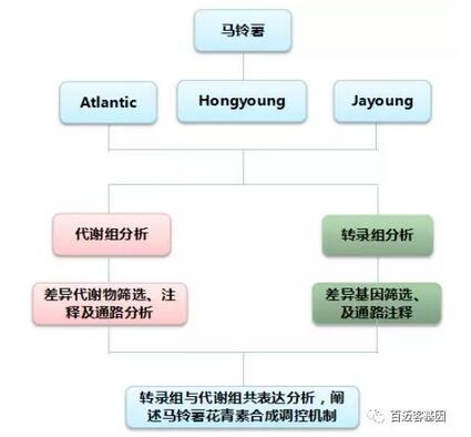 1.本研究對三個(gè)不同品種的馬鈴薯樣品同時(shí)做轉錄組和代謝組,首先通過(guò)代謝組分析不同馬鈴薯品種與色澤合成的差異代謝物,然后采用轉錄組,篩選與色澤合成相關(guān)的類(lèi)黃酮代謝、植物激素、信號通路、轉錄因子相關(guān)的差異基因,最后將色澤合成相關(guān)的差異代謝物和差異基因做關(guān)聯(lián)分析,挖掘馬鈴薯色澤的調控網(wǎng)絡(luò )。