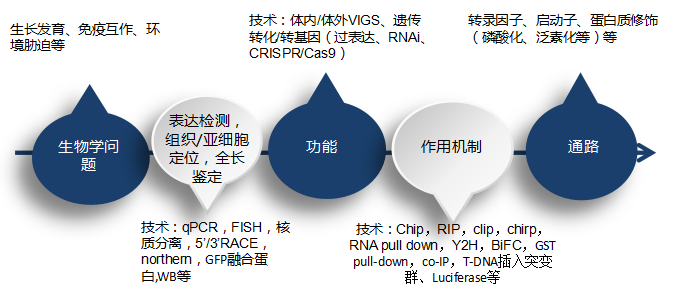 做完這部分基礎的驗證后,就需要驗證基因或ncRNA的功能,功能的驗證主要分兩類(lèi):獲得性研究和缺失性研究,獲得性研究即通過(guò)VIGS或遺傳轉化/轉基因讓目的基因過(guò)表達,缺失性研究即用RNAi、CRISPR/Cas9等技術(shù)讓目的基因沉默或突變?yōu)闊o(wú)功能基因。通過(guò)這部分研究可以驗證目的基因的功能。