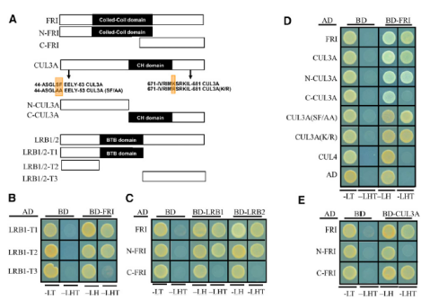 作者先在體外,用酵母雙雜交鑒定FRI蛋白互作的蛋白,發(fā)現FRI的N端區域與其與LRB1和LRB2的相互作用是重要的,FRI的C端區域和CUL3A的N端區域是它們相互作用所必需的。之后用GST pull-down驗證酵母雙雜交結果。
