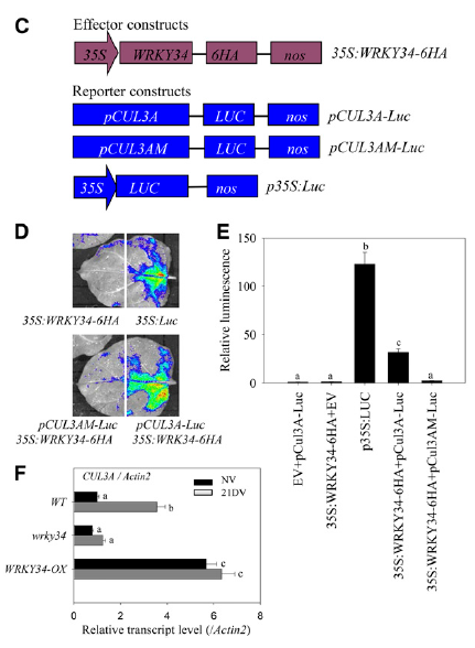比如上面談到的Plant Cell的文章,作者發(fā)現轉錄因子WRKY34的轉錄迅速被冷應激誘導,之后構建pCUL3A-LUC載體和W-box區域突變pCUL3A-LUC載體,與WRKY34共注射入煙草和擬南芥葉原生質(zhì)體,來(lái)驗證WRKY34以預測的W-box與CUL3A啟動(dòng)子結合以增加其CUL3A轉錄,而CUL3A又介導FRI降解調節擬南芥春化過(guò)程中的開(kāi)花,從而把生物學(xué)故事由冷誘導—WRKY34轉錄—CUL3A轉錄—FRI降解—擬南芥春化過(guò)程中的開(kāi)花這樣一條線(xiàn)串起來(lái)。
