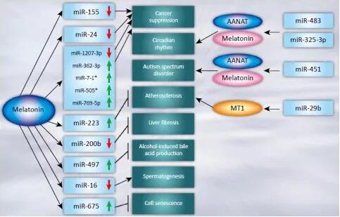 近年來(lái),全轉錄組測序研究越來(lái)越多,拓展了我們對非編碼RNA的認知,也發(fā)現了褪黑激素與非編碼RNA之間存在的功能互作,比如褪黑激素可以通過(guò)與特定的miRNA通路的功能互作,對癌癥的發(fā)展、腦環(huán)境、肝纖維化、自閉癥譜系障礙ASD、動(dòng)脈粥樣化形成和精子發(fā)生等起調節作用;有研究通過(guò)RNA測序,研究了大鼠松果體中lncRNA每天的晝夜豐度變化,或相比于其它組織混合RNA樣本相對高表達的lncRNAs,表明脊椎動(dòng)物節律生物學(xué)中lncRNAs的動(dòng)態(tài)作用。