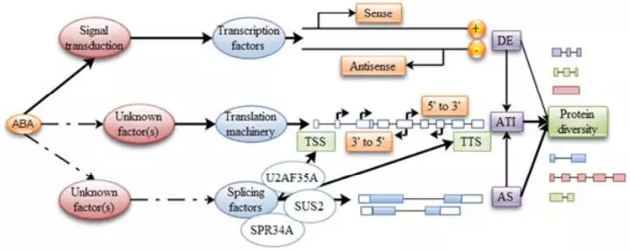 FY Zhu[3]等通過(guò)轉錄組和蛋白組的聯(lián)合分析揭示了擬南芥在脫落酸響應中的可變剪接和翻譯的分子機制,結果中發(fā)現相比于基因的差異表達,發(fā)生差異可變剪接的基因功能多集中在三羧酸循環(huán)、光合作用等途徑,表明在對ABA響應中,相對基因表達,轉錄本的結構變化可能起更為重要的作用,且差異可變剪接事件更容易翻譯成蛋白行使生物學(xué)功能。
