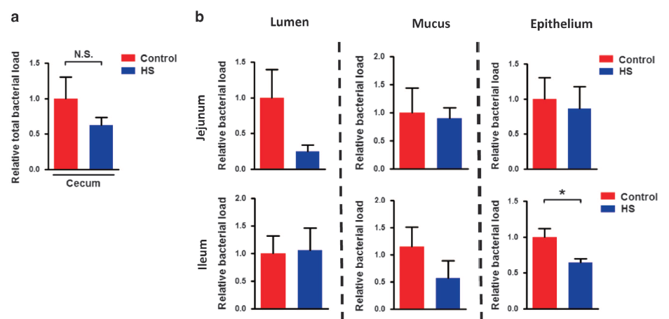慢性高鹽HS喂養后,盲腸中的總細菌負荷略微降低。分離不同部位的菌群,慢性HS喂養后,回腸上皮和結腸腔內的細菌負荷也降低。