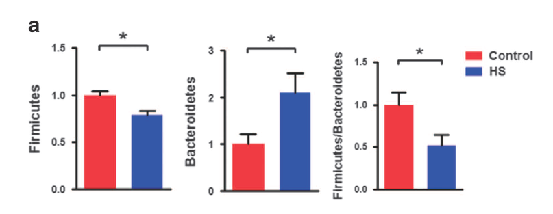 慢性HS處理顯著(zhù)降低厚壁菌門(mén)水平,并提高擬桿菌門(mén)的水平,這表明菌群組成在HS攝入后發(fā)生改變。