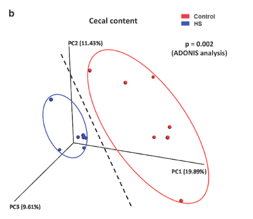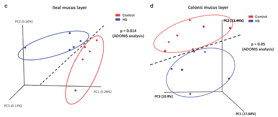 16S rRNA測序表明, HS組的盲腸內容物(cecal content)菌群組成與對照小鼠相比,在門(mén)和綱水平上明顯不同。特別是在HS處理后,盲腸內容物中放線(xiàn)菌門(mén)和厚壁菌門(mén)中的Actinobacteria、Firmicutes和Bacteroidetes以及綱水平中的Actinobacteria,Clostridia和Bacteroidia所占比例顯著(zhù)改變。使用未加權的uniFrac分析的主坐標分析(PCoA)顯示,HS組和對照組盲腸內容物菌群分別聚類(lèi)(P = 0.002,ADONIS分析)。粘膜細菌也是影響腸道病理生理狀態(tài)的重要因素,回腸粘膜( ileal mucosa)和結腸粘膜(colonic mucosa)在整個(gè)胃腸道中的細菌數量最多。因此,進(jìn)一步分析了位于回腸粘膜層和結腸粘膜層的細菌。未加權的uniFrac分析顯示,HS組和對照組在回腸粘液層分別聚類(lèi)(P = 0.014,ADONIS分析)。而在結腸粘液層,對照組和HS組也形成兩個(gè)聚類(lèi)類(lèi)別,分離趨勢明顯(P =0.05,ADONIS分析)。