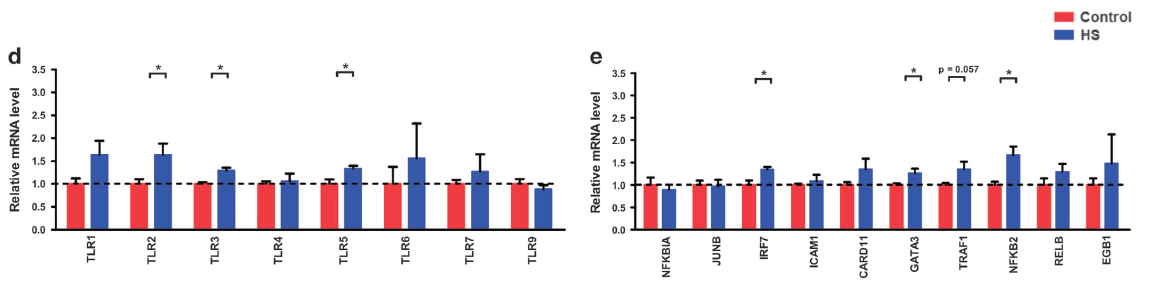 通過(guò)二代測序進(jìn)行轉錄組測序分析,比較對照組和HS組之間涉及“細胞因子-細胞因子受體相互作用”、“NF-κB信號通路”和“Toll樣受體信號通路”的所有相關(guān)基因的表達。結果表明回腸和結腸中,兩組之間許多基因的表達存在差異。