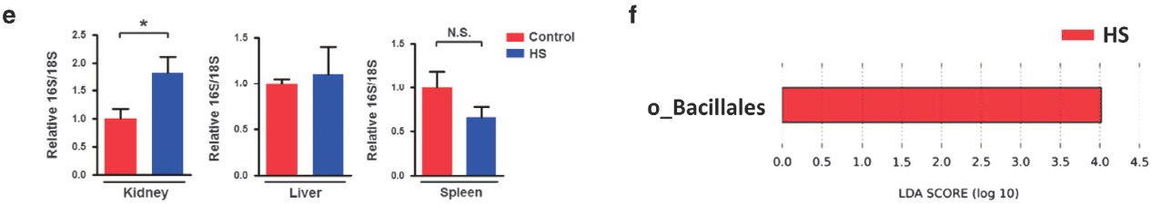 腸道通透性增加可能導致腸道細菌或細菌產(chǎn)物易位至腸外組織。通過(guò)使用16s PCR來(lái)識別細菌DNA,檢測腎臟、肝臟和脾臟中的細菌易位。有趣的是,慢性HS攝入促進(jìn)了細菌易位進(jìn)入腎臟,但不會(huì )進(jìn)入肝臟或脾臟。LEfSe試驗結果表明,與對照組相比,HS處理的腎臟中富含屬于腸道細菌的桿菌。與對照動(dòng)物的腎臟相比,在HS喂養的腎臟中,芽孢桿菌(Bacillus)和游動(dòng)微菌(Planomicrobium)分別增加了2.6倍和8.7倍。