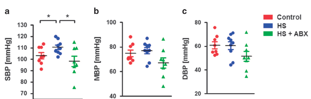 慢性HS喂養可能導致動(dòng)脈壓升高。 雖然HS處理的小鼠的舒張壓(DBP)和平均血壓沒(méi)有增加,但收縮壓(SBP)在慢性HS喂養后顯著(zhù)升高。有趣的是,抗生素治療能夠完全恢復正常SBP。這些數據強烈表明,慢性HS喂養引起的SBP升高取決于腸道微生物菌群。