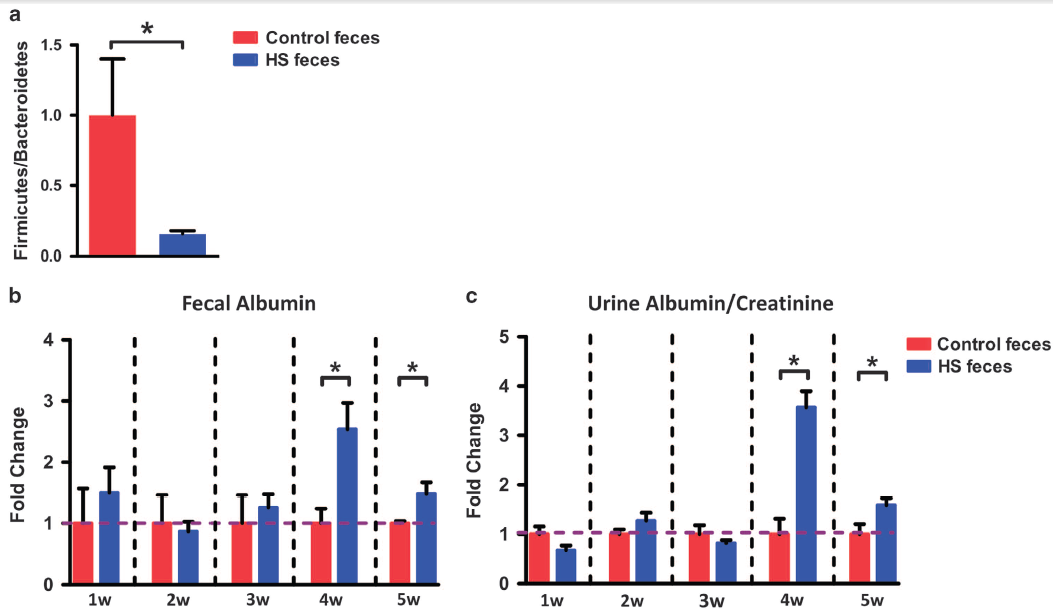 糞便微生物菌群移植實(shí)驗:喂食正常飲食的兩組小鼠口服來(lái)自對照和HS處理的小鼠的糞便。移植8周后,接受對照糞便的對照小鼠中的微生物菌群組成改變的主要標記物–盲腸厚壁菌/擬桿菌比例明顯高于接受HS糞便的小鼠,這一點(diǎn)與作者之前的數據一致,表明HS喂養會(huì )降低盲腸中的厚壁菌 / 擬桿菌比例,并說(shuō)明了糞便微生物菌群移植實(shí)驗是成功的。給藥4周后,糞便白蛋白含量檢測結果表明,接受HS喂養糞便的小鼠的腸通透性顯著(zhù)增加。并且,尿白蛋白(albumin)/肌酸酐(creatinine)比率(在當前研究中觀(guān)察到的腎功能障礙的主要表型),在移植4周后接受HS喂養的糞便的小鼠中也顯著(zhù)增加。最后,與對照小鼠相比,HS糞便移植小鼠中的腎臟凋亡細胞數量顯著(zhù)增加。