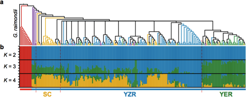 以雷蒙德氏棉(G. raimondii)為外群,利用72,419個(gè)SNPs構建系統發(fā)育樹(shù),顯示:G. herbaceum(草棉)和G. arboretum(亞洲棉)聚類(lèi)成2個(gè)獨立的群(圖4 a-b)。G. arboretum(亞洲棉)進(jìn)一步又分為SC,YZR和YER三個(gè)群,顯示了地理分布模式的差異,進(jìn)而利用PCA分析支持這一結果(圖4 c)。同時(shí)發(fā)現了亞洲棉和草棉是由不同的祖先種馴化而形成。