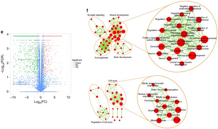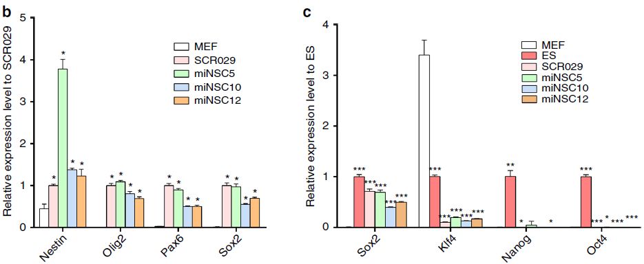 為了進(jìn)一步確認這些miNSC的NSC身份,作者對miNSC10、SCR029和MEF細胞進(jìn)行了RNA-seq分析。miNSC10、SCR029和MEF細胞中基因表達水平的散點(diǎn)圖顯示,miNSC10和SCR209細胞的基因表達水平相似,但均與MEF存在顯著(zhù)差異(圖3a-c)。與這些結果一致的是,聚類(lèi)分析也顯示出miNSC10和SCR029細胞之間有很高的相似性,但它們與MEF之間有很大的差異(圖3d)。與MEF相比,miNSC中有許多基因表達水平下調或上調(圖3e)。作者對上調基因進(jìn)行基因集富集分析(GSEA),發(fā)現了兩組主要的富集基因GO term(圖3f)。其中一組在與神經(jīng)發(fā)育相關(guān)的GO term中富集,如神經(jīng)發(fā)生、神經(jīng)元分化、神經(jīng)系統發(fā)育、神經(jīng)發(fā)生調節、大腦發(fā)育和軸突發(fā)生。另一組富集在細胞分裂GO term,包括細胞分裂、有絲分裂細胞周期、核分裂、姐妹染色單體分離、細胞周期調控。這些數據與miNSC作為NSC及其增殖和自我更新能力是一致的。與此一致的是,進(jìn)一步的分析顯示,盡管有一定的差異,但miNSC10、SCR029、NS528(小鼠ES細胞來(lái)源的NSC)和ciNSC10 (化學(xué)誘導MEF形成的NSC)細胞之間的相似性比MEF更大。