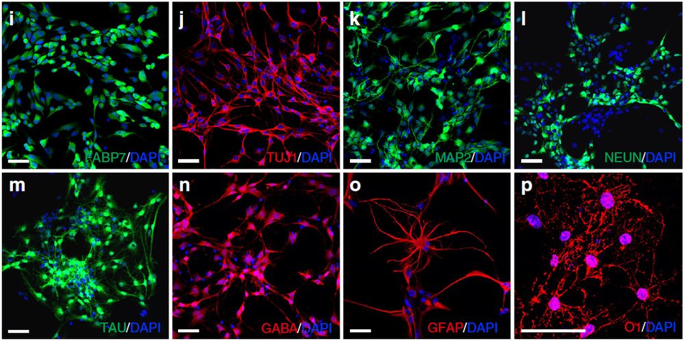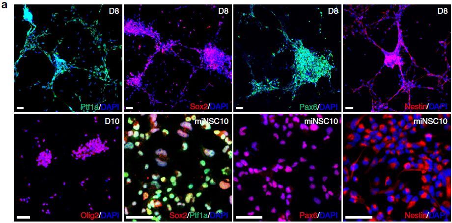 作者分別選取了初代神經(jīng)球,以克隆的方式獲得了多個(gè)重編程的小鼠iNSC (miNSC)細胞系。將它們分別單獨植入到有Dox的平板孔中,發(fā)現NSC形態(tài)的細胞逐漸從粘附的神經(jīng)球生長(cháng)。在含有或不含Dox的情況下,它們被進(jìn)一步擴增和傳遞了30代。在約第10代時(shí),所有miNSC細胞系不再生成神經(jīng)球,開(kāi)始變得均勻,并形成一個(gè)典型的NSC單層。與前期試驗發(fā)現的每個(gè)克隆形成的miNSC具有自我更新能力一致,作者發(fā)現~ 32.6%的miNSC10細胞被EdU 脈沖標記,高于野生型鼠NSC細胞系SCR029(18.9%)(圖1 e,f)。因此,通過(guò)Ptf1a重編程MEF得到的miNSC具有增殖能力和自我更新能力。相比之下,被GFP慢病毒感染的MEF并不能產(chǎn)生典型的NSC標記物免疫性的神經(jīng)球,形成的少數球狀體看起來(lái)異常,并且在培養時(shí)沒(méi)有任何擴增能力。