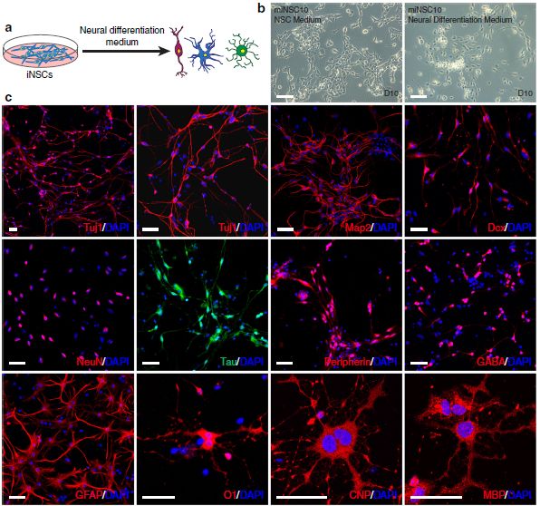 作者想要解決的問(wèn)題是由非神經(jīng)前體細胞TF Ptf1a重編程的miNSC是否可以與NSC 一樣,具有分化成神經(jīng)元、星形膠質(zhì)細胞和少突膠質(zhì)細胞的潛力(圖4a)。當在神經(jīng)分化培養基中培養時(shí),短短幾天內,miNSC就發(fā)生了穩健的形態(tài)學(xué)變化,細胞體積變小、普遍的神經(jīng)突擴張(圖4b)。在培養的2-3周,許多細胞分化為T(mén)uj1、Map2、Dcx、NeuN、Tau、peripherin或GABA免疫的神經(jīng)元(圖4c)。3周時(shí)的定量顯示,83.3%的細胞呈Tuj1陽(yáng)性(圖4e)。此外,不同miNSC細胞系(miNSC5、10、12)顯示類(lèi)似的分化成Tuj1或Map2免疫的神經(jīng)元的能力(補充圖8)。在星形膠質(zhì)細胞分化條件下,87.2%的分化細胞形成神經(jīng)膠質(zhì)原纖維酸性蛋白(GFAP)免疫的星形膠質(zhì)細胞(圖4 c,e),少突膠質(zhì)細胞分化培養基中,miNSC能夠分化為O1、CNP或MBP免疫的少突膠質(zhì)細胞,而26.6%的分化細胞為O1陽(yáng)性(圖4 c,e)。因此,ptf1a重編程的miNSC具有三能性,能夠分化為神經(jīng)元、星形膠質(zhì)細胞和少突膠質(zhì)細胞。