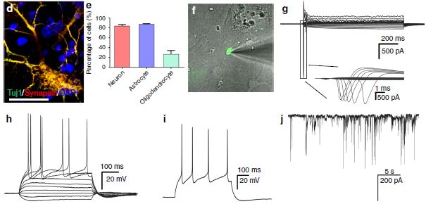 通過(guò)突觸素染色標記試驗、電生理特性分析表明了miNSC分化的神經(jīng)元具有活性膜特性(圖4d、f-j)。因此,ptf1a重編程的miNSC能夠分化為功能神經(jīng)元。